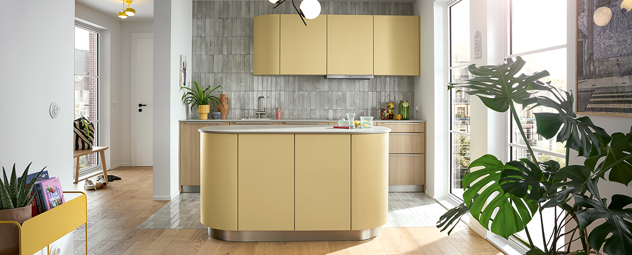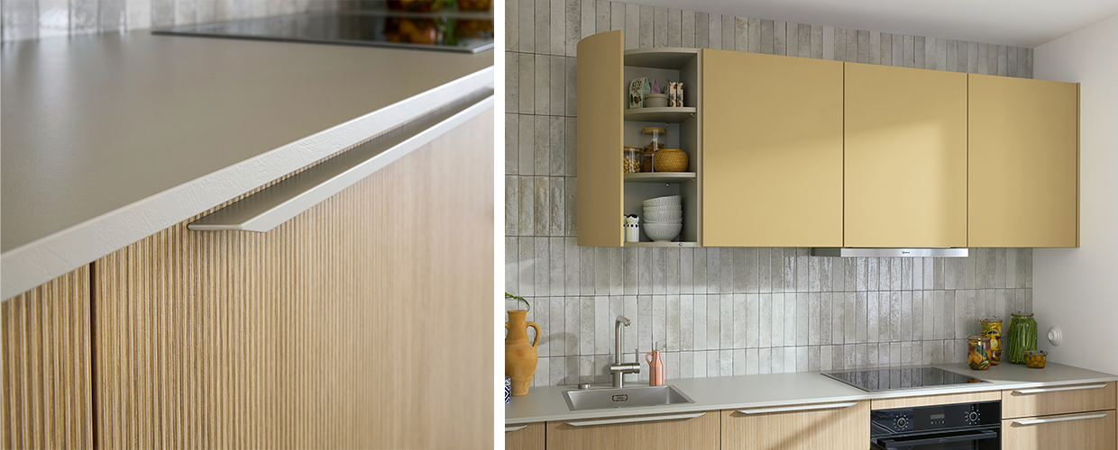 Моделът Line е истинско вдъхновение за любителите на детайла. Характерният за него "grooved look" (фронт с вертикални канали) в дъбов декор внася топлина и дълбочина в пространството. В комбинация със серията Beate в слънчево пастелно жълто, кухнята излъчва уют и мекота.
