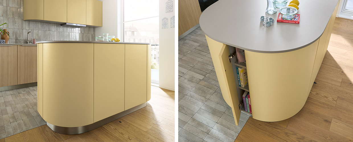 Елегантни извивки: Заоблените крайни елементи Rondo не само пестят място, но и превръщат кухненския остров в хармоничен елемент, който плавно прелива към дневната.
