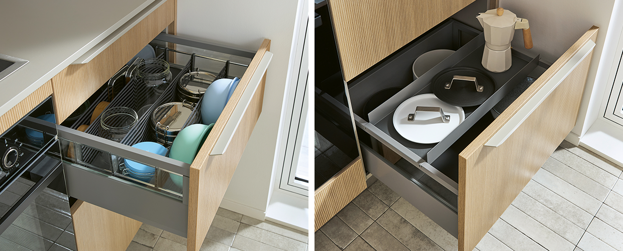 Функционалност и ред: Изключително разнообразие от интелигентни механизми, аксесоари и органайзери за перфектна подредба на вътрешните пространства.