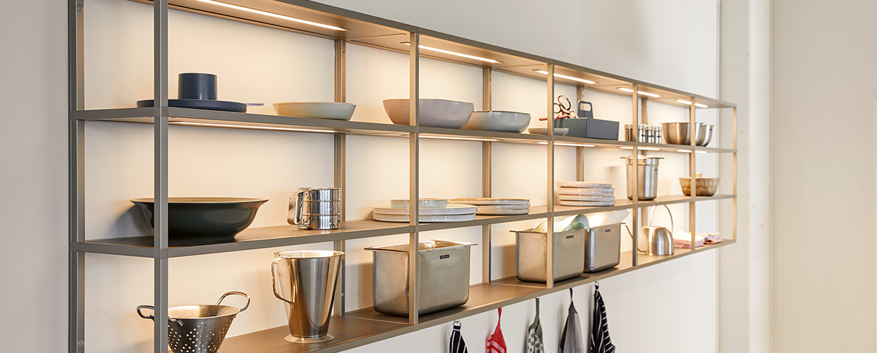 Frame Rack и осветление: Отворените стелажни системи с вградено линейно осветление внасят лекота и превръщат красивите съдове в част от декорацията.