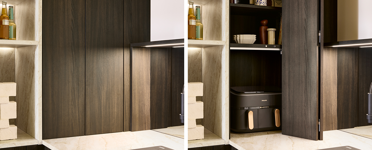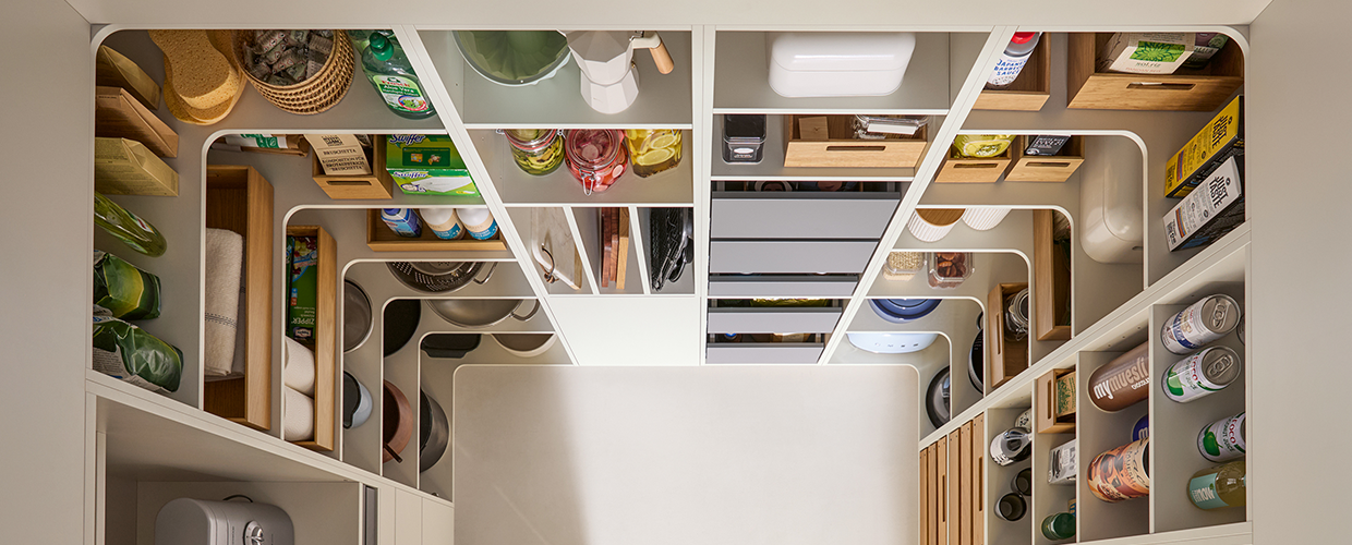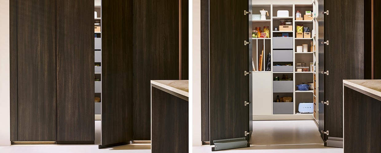 Скрито съхранение: Вградена преходна врата, която позволява бърз достъп от кухнята до килера, без да нарушава общия дизайн в помещението.