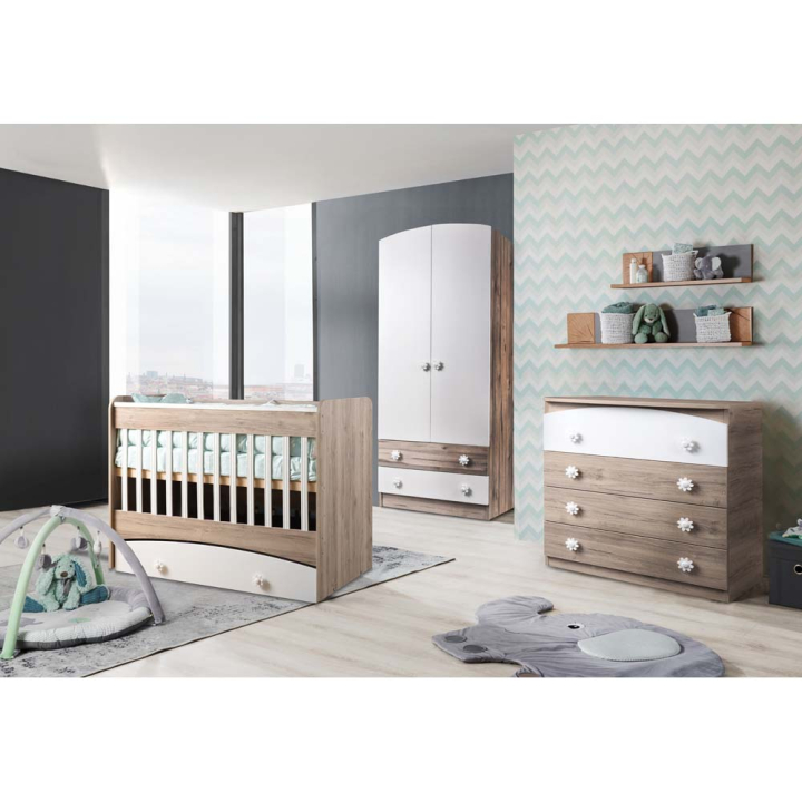 Вградените чекмеджета в конструкцията на леглата осигуряват още пространство за съхранение на принадлежности за бебе, всичко на едно място, само на ръка разстояние. Бебешката колекция мебели се състои от два модела легла-люлки, скрин и двукрилен гардероб.