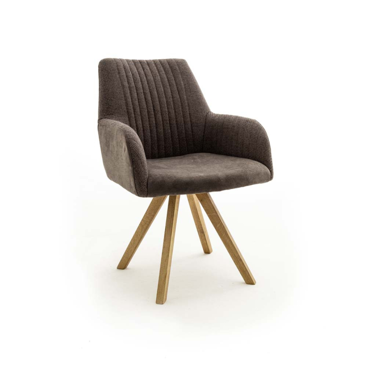 Тапициран трапезен стол с подлакътници с размери Ш:59/Д:61/В:87 см. Облегалката на модела стилно се слива със седалката и подлакътниците, като образува удобен стол тапициран с висококачествен текстил с пълнеж от пяна за максимален комфорт по време на седене. Дамаската на облегалката е с релефен текстил на дълги ивици в кафяв цвят (капучино), а седалката с гладка повърхност приятна на допир. Според личните ви предпочитания може да изберете друг цвят на тапицерията (бордо или сив). Седалката е поставена на 4 дървени крака в светъл дървесен декор, обединени в най-горната си част. Артикулът има красива визия и дизайн който, впечатлява, подходящо обзавеждане, както за трапезарията, така и за хола. Със своите цветове и форма, моделът със сигурност ще допринесе за приятната и заредена с положителна енергия атмосфера в помещението.