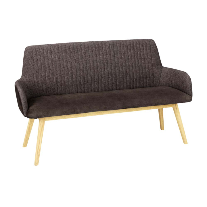 Тапицирана трапезна пейка с подлакътници с размери Ш:157/Д:60/В:90 см. Моделът е подходящо обзавеждане на трапезарията или хола с капацитет да настани удобно 3-ма човека. Пейката е с пълнеж от пяна, цялостно тапицирана с висококачествен текстил, 100% полиестер и може да бъде поставена почти навсякъде в помещението, поради това че е с облечен гръб. Дамаската е изключително атрактивна в декор капучино, но може да изберете друг цвят (бордо или сив). Облегалката е релефна, моделирана на ивици, елегантно сливаща се с подлакътниците. Седалката е с гладка повърхност, здраво прикрепена към четири дървени крака в светъл дървесен декор с маслен ефект. Със своите цветове и форма, моделът със сигурност ще допринесе за приятната и заредена с положителна енергия атмосфера. Комбинацията между текстил и светла дървесина е много удачна и с лекота добавя усещане за комфорт и уют. За да създадете идеалната уютна трапезария с единна визия към пейката може да добавите и трапезен стол с подлакътници със същата дизайнерска линия (00553070048, 00553070049 и 00553070060).