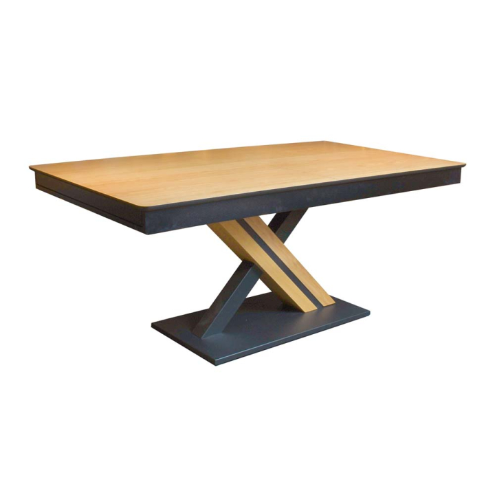 Масата в съвременен индустриален стил, умело съчетава метални и дървени елементи в своя дизайн. Изработена е от МДФ /16мм/ с естествен фурнир - дъб, с правоъгълен разтегателен плот, със заоблени ъгли и широк декоративен кант в черен цвят.