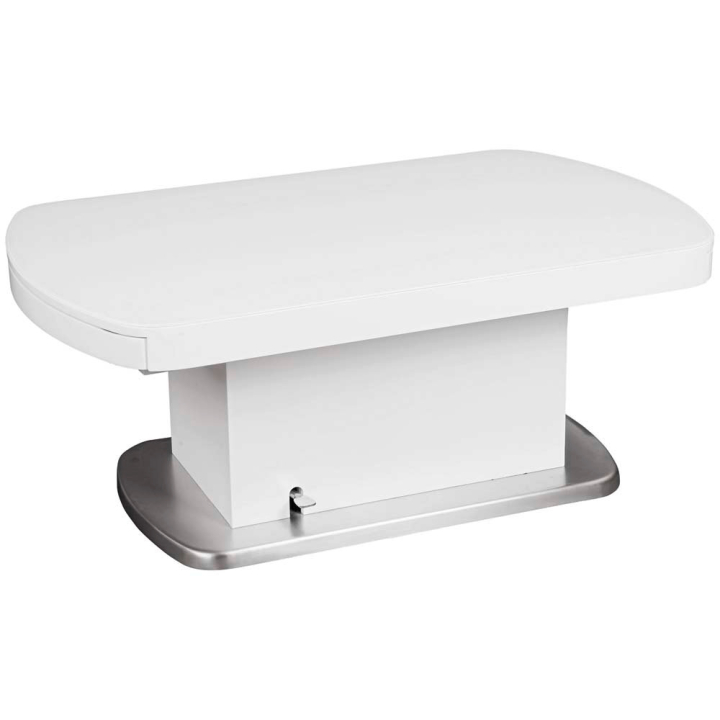 Разтегателна холна маса с повдигащ механизъм и размери Ш:120-180/Д:75/В:50-78 см. Освен практична, масата е и много атрактивна. Плотът променя своята ширина от 120 см до 180 см, като върху него е поставено бяло закалено стъкло. Височината на плота също може да се регулира от 50 см до 78 см, посредством педал в основата. Комбинацията от стъкло, бял мат и иноксова основа, създават силно въздействащ дизайн, който ще внесе домашен уют и класа в помещението.