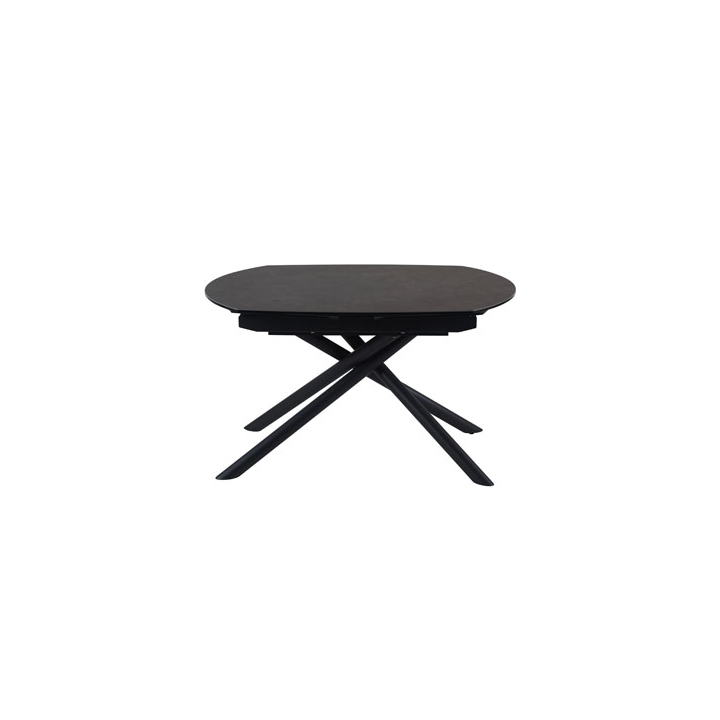 Луксозна разтегателна трапезна маса с размери Ш:130-190/Д:100/В:77 см. Моделът е изключително практичен и елегантен. Притежава черен плот, произведен от 8 мм закалено стъкло, поставено върху 3 мм керамична плоскост. Посредством механизъм, много лесно и бързо трапезната масата може да разшири своята площ от 130 см до 190 см за удобното консумиране на храни и напитки от 4 до 6 човека. Моделът притежава дизайнерска конструкция състояща се от четири метални крака в X-образна форма преплетени и елегантно наклонени.