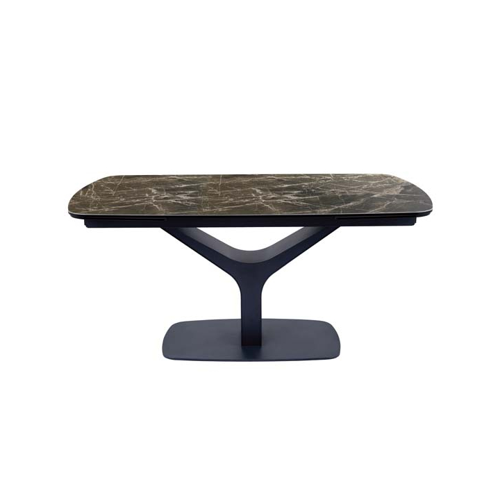 Дизайнерска трапезна маса със стъклокерамичен разтегателен плот с размери Ш:160-240/Д:90/В:76 см. Моделът притежава атрактивна визия в съчетание с практичност и функционалност. Плотът на масата е изработен от 10 мм закалено стъкло поставен върху 3 мм елегантна керамична основа, като лесно и бързо може да промени своята площ от 160 до 240 см. Трапезната маса предоставя възможност за комфортна консумация на храни и напитки от 4 до 8 човека. Настанете всичките ви любими хора за незабравими и вкусни закуски, обеди и вечери.