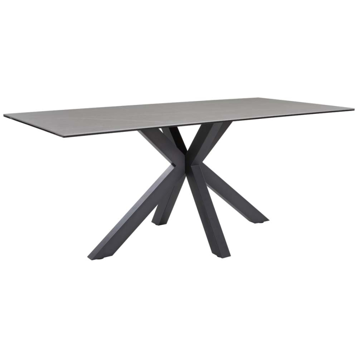 Модерна трапезна маса с размери Ш:180/Д:90/В:76 см. Артикулът притежава красив керамичен плот с декор на естествен камък с фино стъклено покритие. Плотът е здраво фиксиран в средата към два Х-образни метални преплетени крака в черен цвят с протектори щадящи пода. Дизайнерският подход може да се види във всеки един елемент на масата. Силно впечатление ще ви направи тънкият плот с текстурата на естествен камък и масивната метална конструкция. Трапезната маса е идеално решение за обзавеждане на модерна дневна, като максималният капацитет за консумация на храни и напитки е до 6 човека.