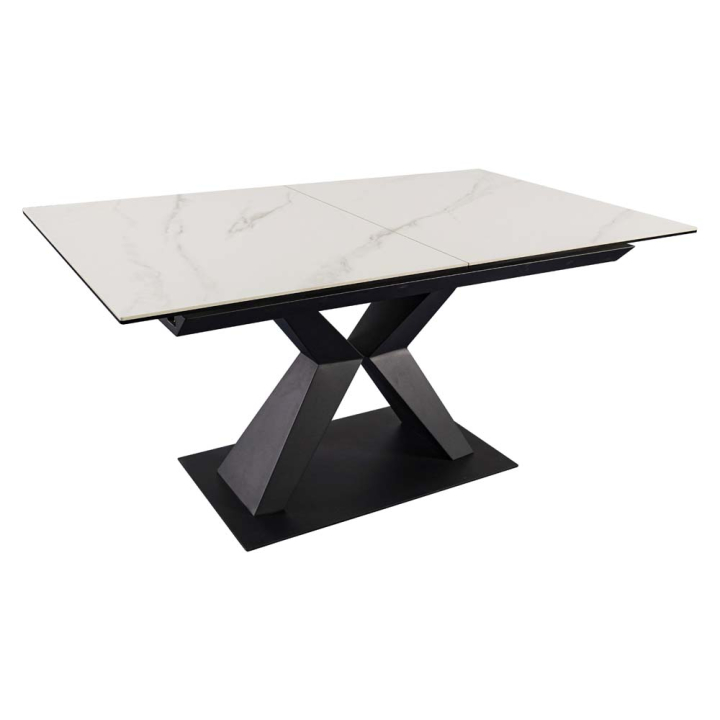 Модерна разтегателна трапезна маса с керамичен плот със стъклено покритие с размери Ш:160-210/Д:90/В:76 см. Артикулът притежава красив керамичен плот с декор на естествен камък с фино стъклено покритие. Плотът е здраво фиксиран в средата към метална модулна основа в черен цвят. Дизайнерският подход при изработката може да се види във всеки един елемент на масата. Силно впечатление ще ви направи тънкият плот с текстурата на естествен камък и масивната метална конструкция. Трапезната маса е идеално решение за обзавеждане на модерна дневна, като максималният й капацитет за консумация на храни и напитки от 6 до 8 човека.