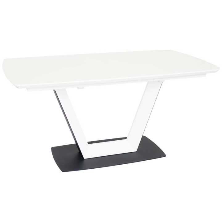 Луксозна трапезна маса с разтегателен плот с размери Ш:160-210/Д:90/В:76 см. Моделът със сигурно ще добави лукс и класа към помещението. Масата е произведена с висококачествени материали с внимание към детайла, което гарантира дългогодишната употреба на модела. Плотът е произведен от MDF с овални ъгли и бяло матово покритие, върху който е поставено допълнително стъкло по цялата повърхност. Стъклото гарантира, че плотът няма да бъде механично надраскан или захабен при употреба. При допир върху стъклената повърхност не остават пръстови отпечатъци, които постоянно трябва да почиствате. Прецизна изработка на трапезната маса може да се види както по отношение на атрактивния дизайн, така и по отношение на нейната функционалност. Посредством синхронен разтегателен механизъм, плотът на маста може да разшири своята площ и съвсем спокойно да настани от 4 до 8 човека за консумацията на храни и напитки. Притежава здрава и стабилна V-образна колонна основа, декорирана в черно и бяло. Насладете са на всеки миг в компанията на любими хора в луксозна и престижна обстановка.