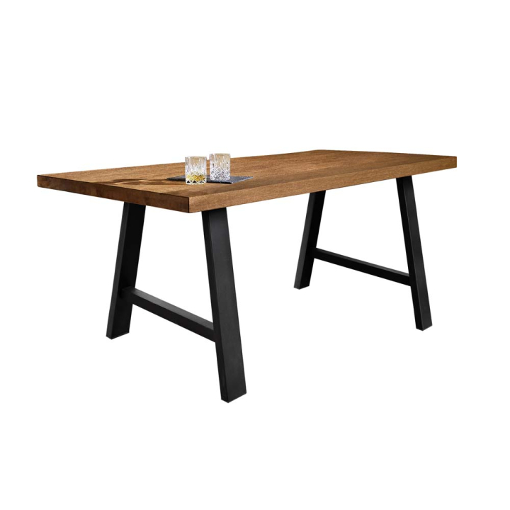 Трапезна маса в индустриален стил с размери Ш:140/Д:95/В:76 см. Висококачествена и много стабилна трапезна маса, произведена от масив (дъб) с декор Орех антик и стомана. Плотът е с прав кант и  големина 140/95 см, като съвсем спокойно може да настани до 6 човека за приятни закуски, вкусни обеди и очарователни вечери в компанията на любими хора. Краката са произведени от метал в А-образна форма фино лакирани в черен цвят. Прекрасно допълнение към хола или дневната.