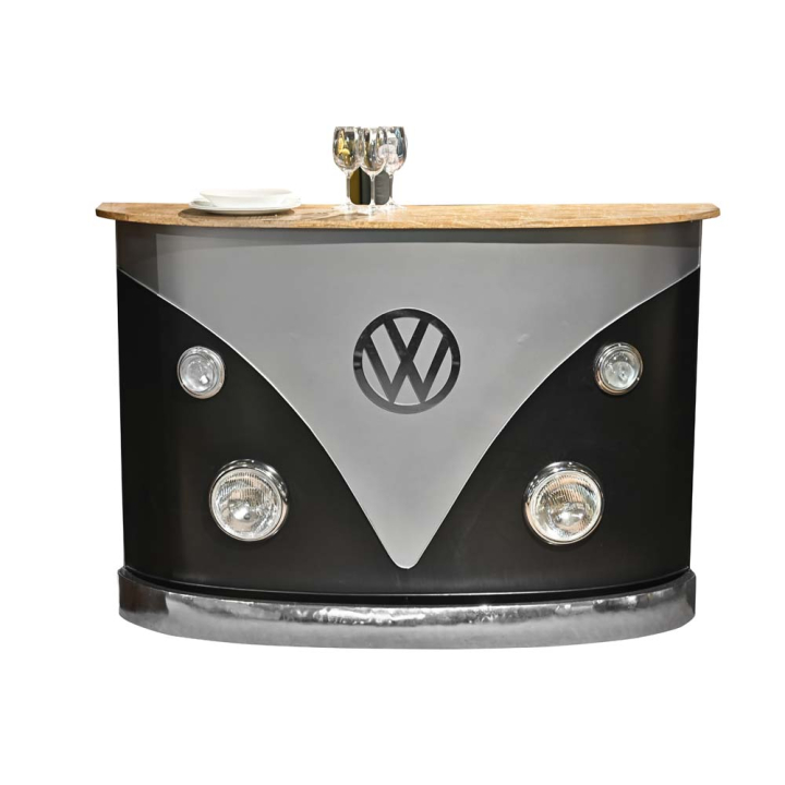 ОПИСАНИЕ Една забавна препратка към безгрижния хипарски живот и намигване към всички млади по душа и сърце. В тази бар-маса, изработена от метална конструкция, мигновено ще познаете уникалния VW стил. Задната страна на бар-масата има 2 плота от състарено дърво, 4 регала за бутилки и много свободно място за чаши и други вещи.