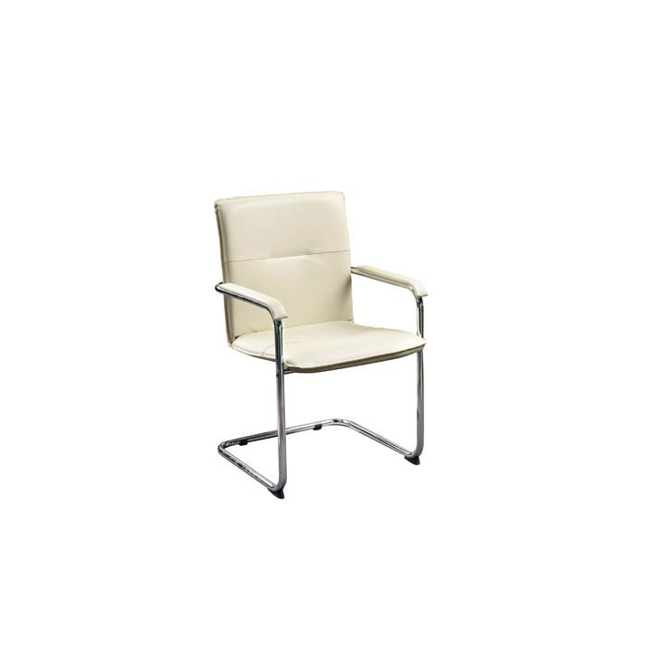 Конзолен офис стол с тапицерия от еко кожа с размери Ш:54.5/Д:53/В:87 см. Столът притежава отлична визия и стил. Характеризира се с удобна седалка произведена от многослойна дървесина, както и комфортна облегалка с пълнеж от PU пяна, поставени на конзолна хромиран рамка с протектори щадящи пода. Тапицерията на модела е произведена от висококачествена еко кожа (клас V**), изключително лесна за поддържане и почистване. В зависимост от вашите предпочитания и интериора на помещението, може да избирате дали столът да бъде с бежова дамаска или в класическо черно.