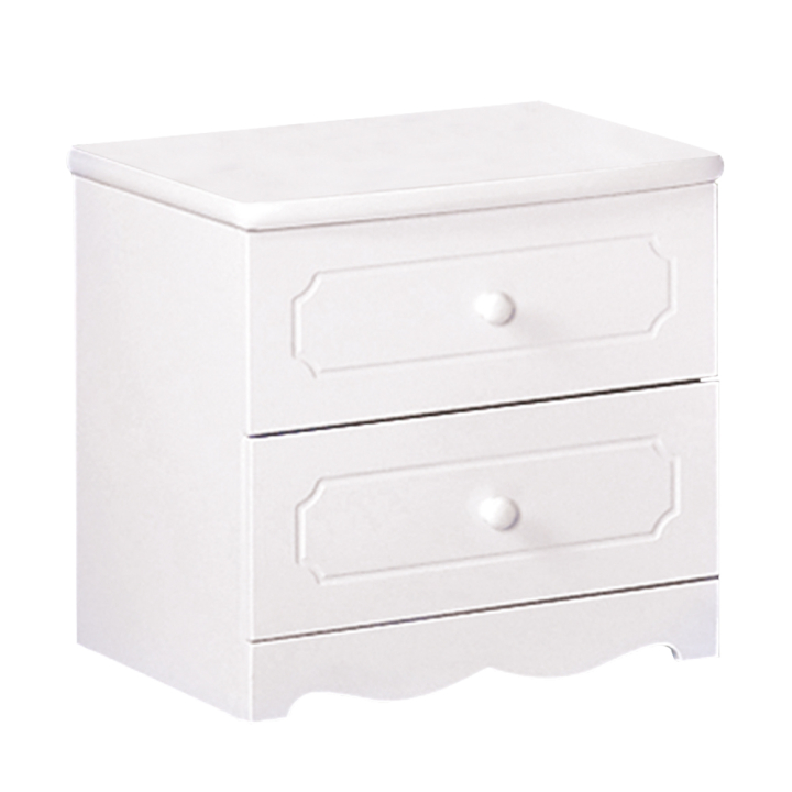 Нощно шкафче с две чекмеджета с размери Ш:48/Д:44/В:45 см. Със своята красива декорация и бял цвят, моделът е удачно обзавеждане за детска стая. Белият цвят ще внесе много свежест и чистота, а красивите фрезовани фронтове на чекмеджетата ще допринесат за уникалната атмосфера в помещението. Продуктът е моделиран с много красив декоративен цокъл. Артикулът е здрав и стабилен, произведен от ПДЧ и MDF с две функционални чекмеджета за съхранението на дреболийки в спалнята.