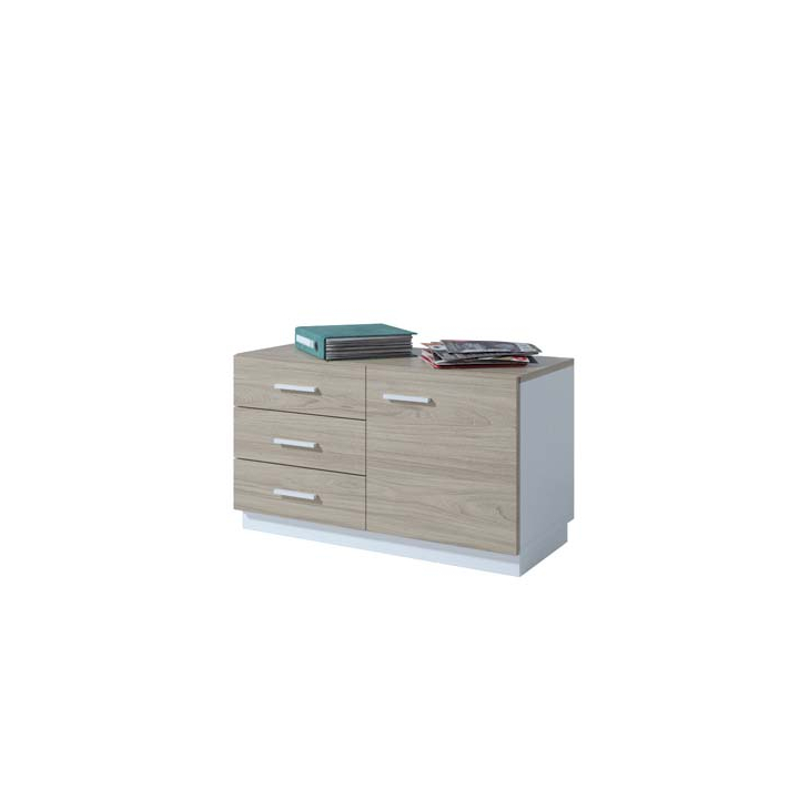 Офис шкаф с чекмеджета с размери Ш:92/Д:45/В:55 см. В ляво на модела са поставени три чекмеджета, подредени едно под друго, с фронтове от светъл дървесен декор и сребристи дръжки. В дясно е обособено самостоятелно отделение с врата на панти.