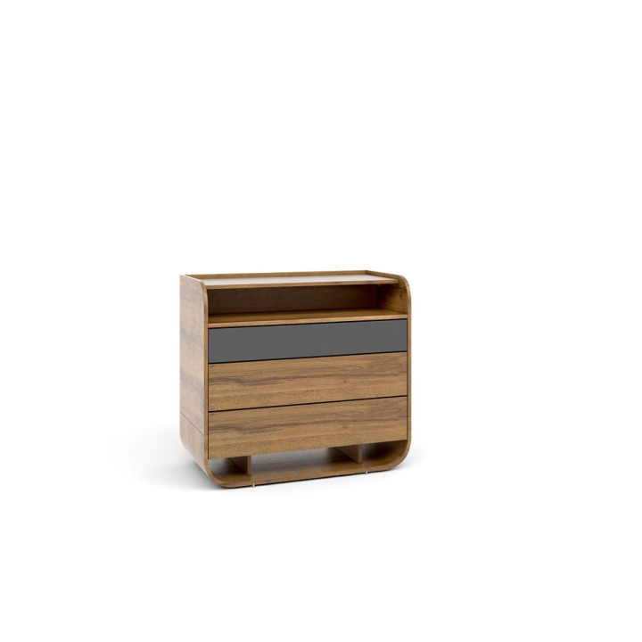 Комод с три чекмеджета с размери Ш:100/Д:50/В:90 см. Моделът е произведен от ПДЧ в тъмен дървесен декор с уникална конструкция и форма. Притежава плот където може да поставите малки домашни предмети, като под него е обособена отворена ниша. Комодът е здраво стъпил по цялата повърхност на пода, като много атрактивно основата е извита в двата края и обособява основната дизайнерска особеност на модела. Трите чекмеджета са с водачи Quadro и механизъм за плавно затваряне осигуряващи максимално удобство. От същата серия мебели се предлага двойно легло, нощни шкафчета и комод.