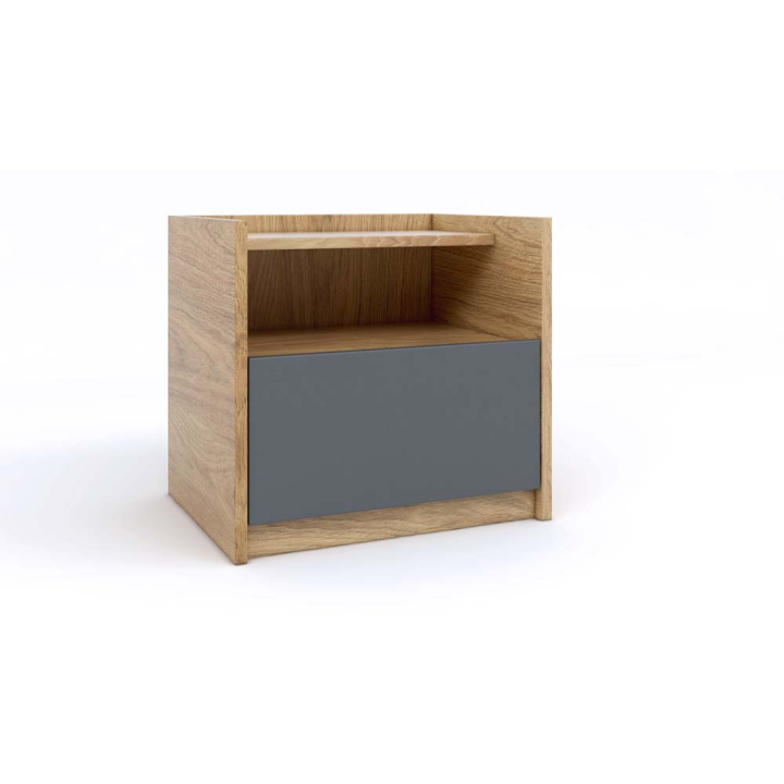 Нощно шкафче с чекмедже с размери на продукта Ш:50/Д:40/В:47 см. Разполага с чекмедже за съхранението на дреболийки, отворена ниша, както и практичен плот за поставянето на нощната лампа. Моделът е изработен в два декора: сив цвят и тъмна дървесна текстура. Може да бъде произведено по индивидуални размери с височина от 41 до 47 см, ширина от 35 до 55 см и дълбочина от 36 до 45 см. Поставено до спалнята всичките ви лични вещи, от които се нуждаете вечер ще са винаги до вас. Шкафчето е здраво и стабилно, произведено от ПДЧ, цялостно стъпило по повърхността на пода, осигуряващо нужната стабилност на нощната лампа. Артикулът е модул от система за обзавеждане на спалня София.