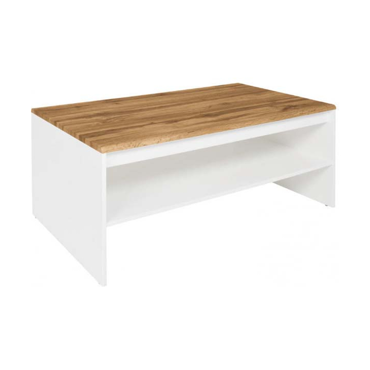 Модерна холна маса с размери Ш:110/Д:65/В:45.5 см. Разполага с удобен плот, под който е монтиран 1 рафт. Със своите размери може да настани около 6 човека. Масата е произведена от ПДЧ и MDF със стабилна конструкция. Бялото покритие е преобладаващо, като само плота e в дървесна текстура. Репродукцията на дъба в светли нюанси добавя не само разнообразие в дизайна, но и много положителна енергия, емоция, топлина и уют към интериора. Детайл, който ще вдъхне живот към помещението.