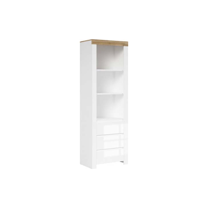 Висок шкаф с чекмеджета с луксозно гланцово покритие с размери Ш:68/Д:42/В:203.5 см. Разполага с 1 отворено отделение с монтирани в него 2 рафта. В основата са поставени 3 практични чекмеджета. Шкафът ще ви предостави възможност да съхранявате на рафтове и в чекмеджета най-различни предмети от ежедневието. Произведен е със стабилна конструкция от ПДЧ в прави линии с чекмеджета и врати с фрезове за дръжки. Луксозното бяло гланцово покритие е преобладаващо, като само горния плот и горната фронтална плоскост са в дървесна текстура. Детайл, който ще вдъхне живот към помещението. Репродукцията на дъба в светли нюанси добавя не само разнообразие в дизайна, но и много положителна енергия, емоция, топлина и уют към интериора.