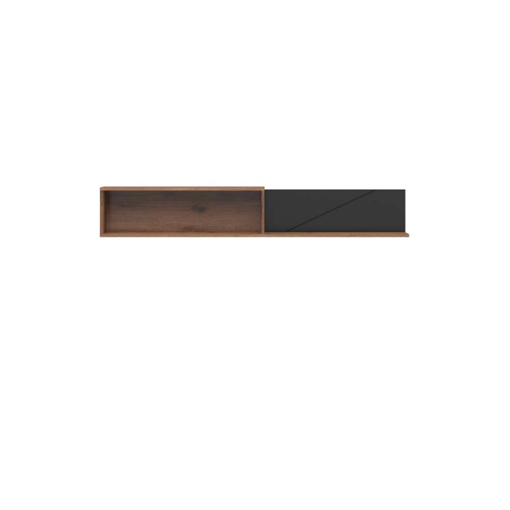 Практична полица с размери Ш:156/Д:22/В:25 см. Моделът е предназначен за стенно окачване, като удачно би стоял в дневната, спалнята или коридора. Продуктът се състои от рафт и ниша за съхранението на книги, артефакти, вази и други малки предмети. Атрактивно е декориран в черен мат и тъмен дървесен декор. Артикулът е с големи размери и предоставя много място за съхранение.