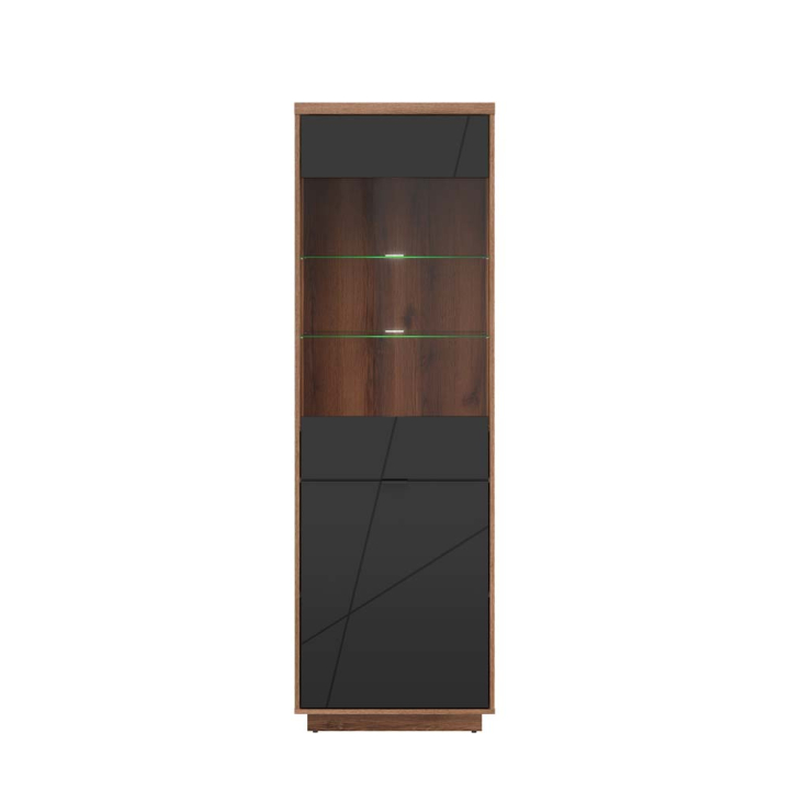 Шкаф витрина с размери Ш:64/Д:42.5/В:200.5 см. Моделът се състои от едно отделение с две врати на панти с мех. за плавно затваряне, едната от които със стъклена витрина. В шкафа са монтирани три рафта от ПДЧ, два рафта от стъкло. Корпусът на шкафа е произведен от ПДЧ с цокъл, а вратичките от MDF с красиви декоративни канали. Витринният шкаф е изключително подходящ за съхранението на сервизи, произведения на изкуството и артиситчни акценти в хола.