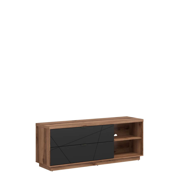 ТВ шкаф Форн с 2 чекмеджета и 2 ниши в тъмен дървесен декор и черен мат, размери: 156/42,5/61 см