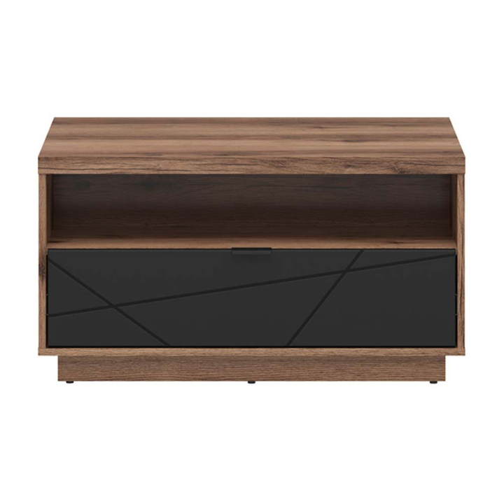 Холна маса с чекмедже с размери на модела Ш:90/Д:60/В:48.5 см. Моделът е здрав и стабилен, произведен от ПДЧ, стилно декорирано в тъмен дървесен декор и черен цвят. Веднага ще ви направи впечатление красивия фронт на чекмеджето, декорирано в черен мат с три дизайнерски улея и черна дръжка. Чекмеджето е много удобно за съхранението на малки домашни предмети в хола, като практично притежава мех. за плавно затваряне, както и възможност за пълно издърпване. Дори и препълнено, пак ще изпълнява своята функция без проблем, поради висококачествените релси, на които е поставено. В нишата под плота има достатъчно място за книги, списания, каталози, които винаги ще са на една ръка разстояние за бърз преглед.