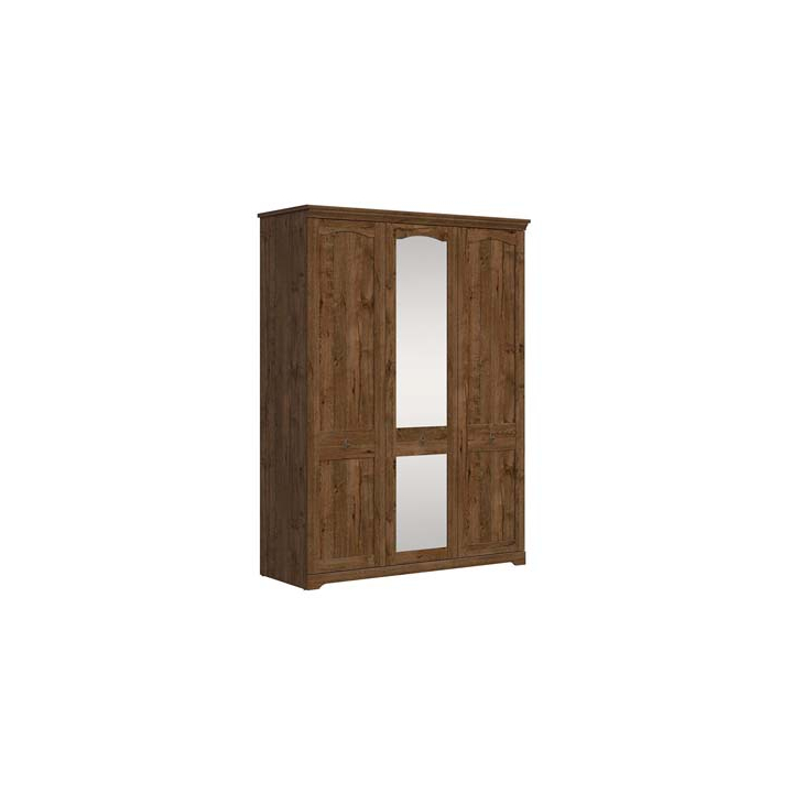 Трикрилен винтидж гардероб с размери Ш:153/Д:59/В:208 см. Зад вратите на панти с безшумно затваряне са монтирани 1 горен рафт и 1 лост за закачалки. Дълбоките рафтове са изключително удобни за поставянето на дрехи, одеяла, завивки и др. На лоста може да съхранявате всичките ви дрехи, които ще са точно така както сте ги поставили, след като сте ги изгладили. В основата има много свободно пространство, където практично може да подредите кутии за обувки или кутии за дрехи, куфари и др. Моделът е произведен от ПДЧ и MDF изцяло в тъмна дървесна текстура с красив арт корниз и цокъл. Дизайнерските врати с рамка и красива горна дъга са с дръжки тип халка в месингов цвят, които стоят страхотно на фона на тъмната дъбова репродукция. Тъмната дървесна сърцевина е много подходяща за обзавеждане на спалня или дневна, поради усещането за близост и връзка с природата. Ежедневен безграничен домашен уют, който ще ви вдъхновява.