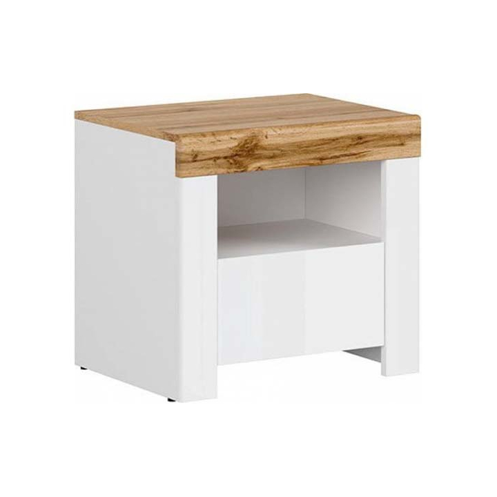 Модерно нощно шкафче с бяло гланцово покритие с размери Ш:54.5/Д:42/В:50.5 см. Разполага с компактен плот, под който са обособени 1 отворена ниша и 1 чекмедже с безшумно затваряне. Шкафчето ще ви предостави възможност да съхранявате предмети от ежедневието до леглото, винаги на една ръка разстояние.