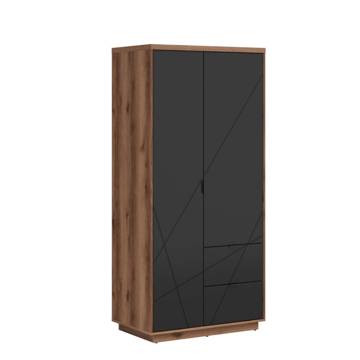 Двукрилен гардероб с две чекмеджета с размери Ш:94/Д:56.5/В:200.5 см. Моделът разполага с две практични отделения с различно вътрешно разпределение. В лявото отделение, зад вратата с демпфер, предоставя много място за съхранението на ризи, сака, костюми и др. посредством монтираните два лоста за закачалки. В дясното отделение са монтирани три рафта, оформящи четири ниши, като под него проектантите са поставили две чекмеджета. Конструкцията на гардероба е произведена от ПДЧ, а вратичките от MDF с атрактивни декоративни улеи. Моделът е стабилен, цялостно стъпил по повърхността на пода. Цветовото оформление на продукта е не само атрактивно, но и функционално. Корпусът и всички вътрешни отделения са красиво декорирани с тъмна дървесна текстура, като единствено вратичките са в черен мат стилно открояващи се от конструкцията. С този гардероб бързо и лесно ще организирате личното си пространство, като дрехите с различно предназначение и стил ще намерят най-практичното място.
