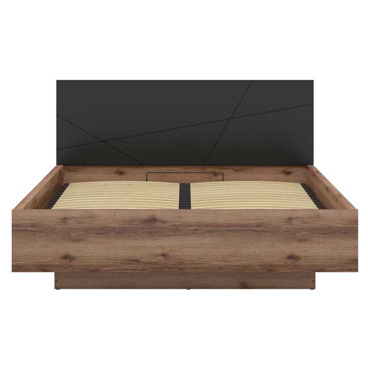 Двойно легло за матрак 160/200 см с размери на продукта Ш:169.5/Д:206/В:98.5 см. Веднага ще забележите красивата табла с декоративни улеи в черен мат, която по естествен начин допълва цялостната визия на леглото в тъмна дървесна текстура. Леглото разполага с подматрачна рамка с амортисьори, под която е обособена обширна ракла. Моделът е стабилен, цялостно стъпил по повърхността на пода. С това легло не само ще спите комфортно и здравословно в приятна атмосфера, но и практично ще може да организирате личното си пространство, като в раклата под матрака ще намерят място завивките, одеялата, възглавниците и др. лични вещи.