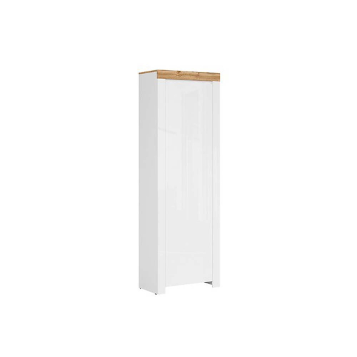 Модерен шкаф за антре с луксозно гланцово покритие с размери Ш:68.5/Д:37/В:203.5 см. Подходящ за обзавеждане на входно помещение. Разполага с 1 отделение с 1 врата на панти с плавно и безшумно затваряне. Зад вратата са поставени 2 рафта от ПДЧ в бял цвят и 1 лост за дрехи. Функционалното вътрешно разпределение на шкафа е сигурен помощник, където ежедневно ще съхранявате на рафтове и закачалки дрехи, шалове, шапки, палта обувки, пантофи и др. в антрето, деликатно скрити зад вратата. Произведен е със стабилна конструкция от ПДЧ в прави линии с врата с фрезове за дръжки. Луксозното бяло гланцово покритие е преобладаващо, като само горния плот и горната фронтална плоскост са в дървесна текстура. Детайл, който ще вдъхне живот към помещението. Репродукцията на дъба в светли нюанси добавя не само разнообразие в дизайна, но и много положителна енергия, емоция, топлина и уют към интериора.