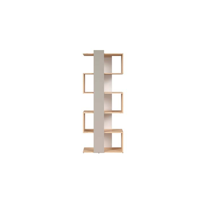 Модерна 5 редова етажерка с дясна конфигурация с размери Ш:75/Д:38.5/В:191 см. Притежава красива визия и нестандартна конструкция, подходящо обзавеждане за повечето детски стаи. Въпреки своята форма, етажерката е много здрава и стабилна. Всеки рафт е с макс. товароносимост до 5 кг, където място ще намерят детски книжки, учебници, играчки, семейни снимки, грамоти и трофеи от състезания постигнати от вашето дете, всичките прилежно подредени. За да бъде атмосферата в детската стая по-приятна и атрактивна, етажерката е проектирана в 3 различни текстури: светъл дървесен декор, бял гланц и сив цвят. Моделирана по този начин, създава привлекателна младежка атмосфера в помещението. Фронталната опорна плоскост е в неутрално сиво, а гърба в луксозно бяло гланцово покритие. Рафтовете са в дървесна текстура, репродукция на светъл бук заредена с много вътрешна топлина и домашен уют. Етажерката е произведена от висококачествено ПДЧ в красив дизайн, който ще добави много чар. Продуктът е подходящ за функционалното обособяване на тематични и декоративни кътове в жилището. Дизайнерска конструкция е с бърз и лесен монтаж, само следвайте инструкцията. За повече сигурност е препоръчително етажерката да бъде фиксирана към стената.