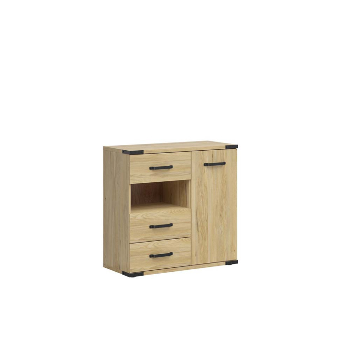 Комод с чекмеджета с размери Ш:90/Д:40/В:88 см. Комодът е произведен от ПДЧ с красива текстура на светъл ясен, репродукция със силно изразена дървесна сърцевина в натурални цветове. Състои се от три чекмеджета, една отворена ниша и отделение с врата на панти зад която е монтиран един рафт с макс. товароносимост до 4 кг. Дървесният декор в светли тонове е изключително подходящ за обзавеждане на детска стая. Освен че, ще добави уют, шарката на естественото дърво създава усещане за топлина, сигурност и солидност, като лесно може да се комбинира с мебели в други цветове и декори. Ъглите на модела са с добавени черни планки, които освен отличителен елемент, правят комода завършен и по-привлекателен. Комодът е част от серия мебели за обзавеждане на детска стая. Създайте приятна, комфортна и здравословна атмосфера в помещението с мебели за детска стая Лара.