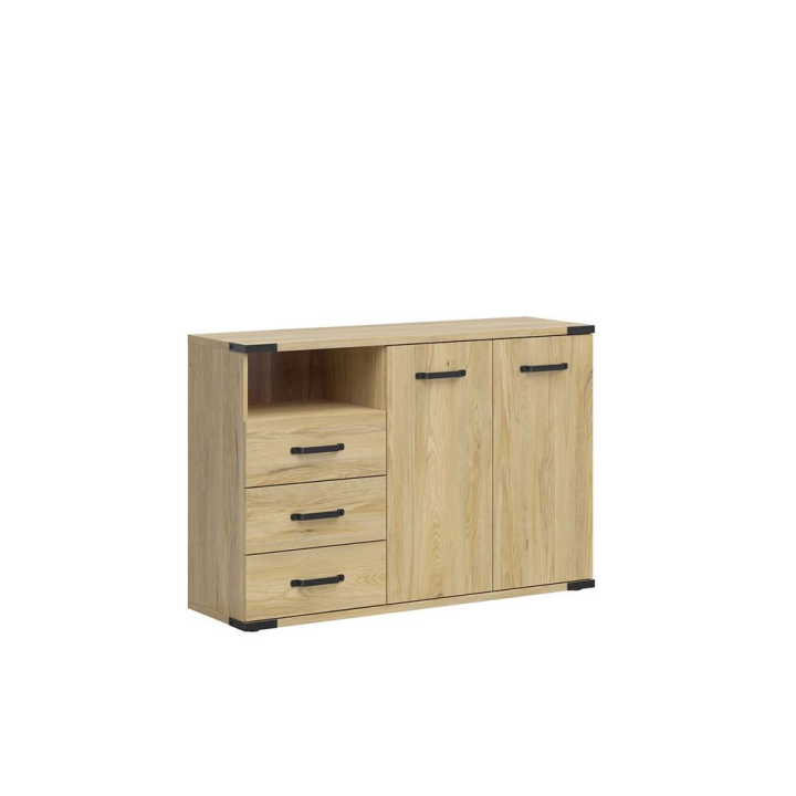 Комод с чекмеджета с размери Ш:130/Д:40/В:88 см. Комодът е произведен от ПДЧ с красива текстура на светъл ясен, репродукция със силно изразена дървесна сърцевина в натурални цветове. Състои се от три чекмеджета и едно отделение с две врати на панти, зад които е монтиран един рафт. Дървесният декор в светли тонове е изключително подходящ за обзавеждане на детска стая. Освен че, ще добави уют, шарката на естественото дърво създава усещане за топлина, сигурност и солидност, като лесно може да се комбинира с мебели в други цветове и декори. Ъглите на модела са с добавени черни планки, които освен отличителен елемент, правят комода завършен и по-привлекателен. Комодът е част от серия мебели за обзавеждане на детска стая. Създайте приятна, комфортна и здравословна атмосфера в помещението с мебели за детска стая Лара.