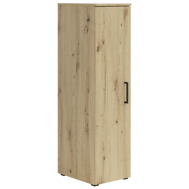 Шкафът притежава изчистена визия в светъл дървесен декор с черни крачета и дръжки.