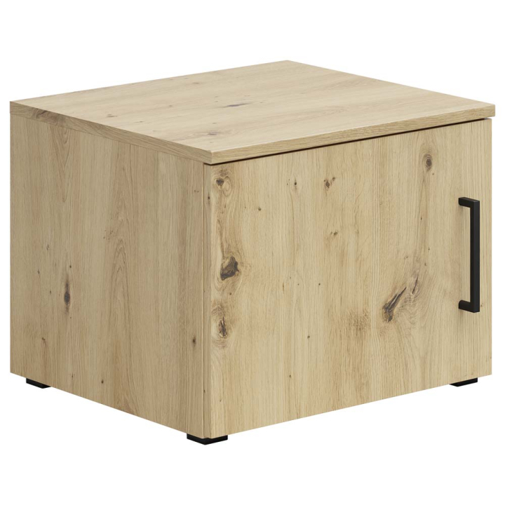 Шкафът притежава изчистена визия в светъл дървесен цвят с черни крачета и дръжки, които добавят завършеност на цялостния облик.