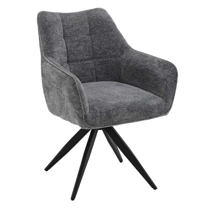 Модерен трапезен стол с удобна седалка с размери Ш:61/Д:59/В:86 см. Облегалката на модела стилно се слива със седалката и подлакътниците, като образува удобно кресло тапицирано с висококачествен текстил. Седалката е с пълнеж от пяна и покет пружини, а облегалката и подлакътниците с пяна. Така моделиран столът е изключително удобен, като предлага завиден комфорт и удобство. Седалката е здраво фиксирана към четири метални крака, като практично може да се върти на 360°, за заемането на най-удобна позиция на тялото. Артикулът има дизайнерски акцент, като е подходящо обзавеждане, както за дома, така и за офиса.