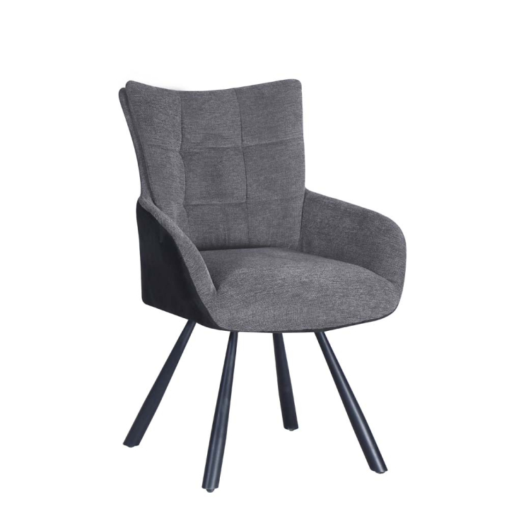 Атрактивен и комфортен трапезен стол с размери Ш:60/Д:63/В:90 см. Притежава детайли, които не само изглеждат страхотно, но и създават комфорт. Облегалката е стилно извита, с прошита обемна възглавница, моделирана на квадрати посредством декоративни шевове, която се слива с два подлакътника за комфортното поставяне и релакс на ръцете. Дамаската е в два цвята, сив и черен, изключително приятна на допир. Стоманените крака са леко наклонени, които освен много здрави, поставни по този начин добавят много чар към модела. Седалката е с пълнеж от покет пружини и пяна с възможност за завъртане на 360°.