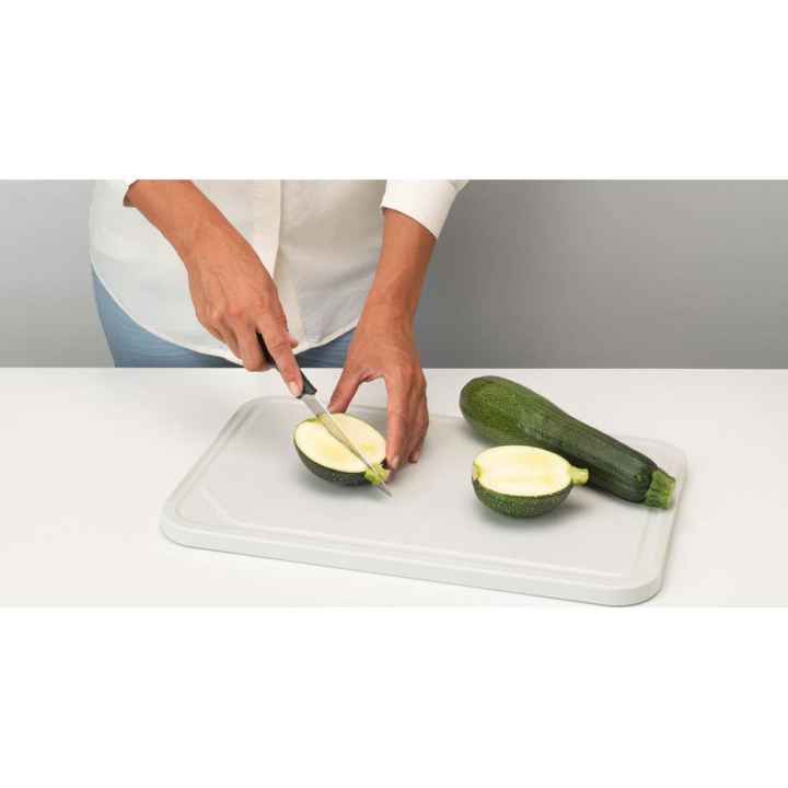 - Предвидени жлебове, предпазващи от разпръскване на нарязаните продукти, както от разливане върху плота