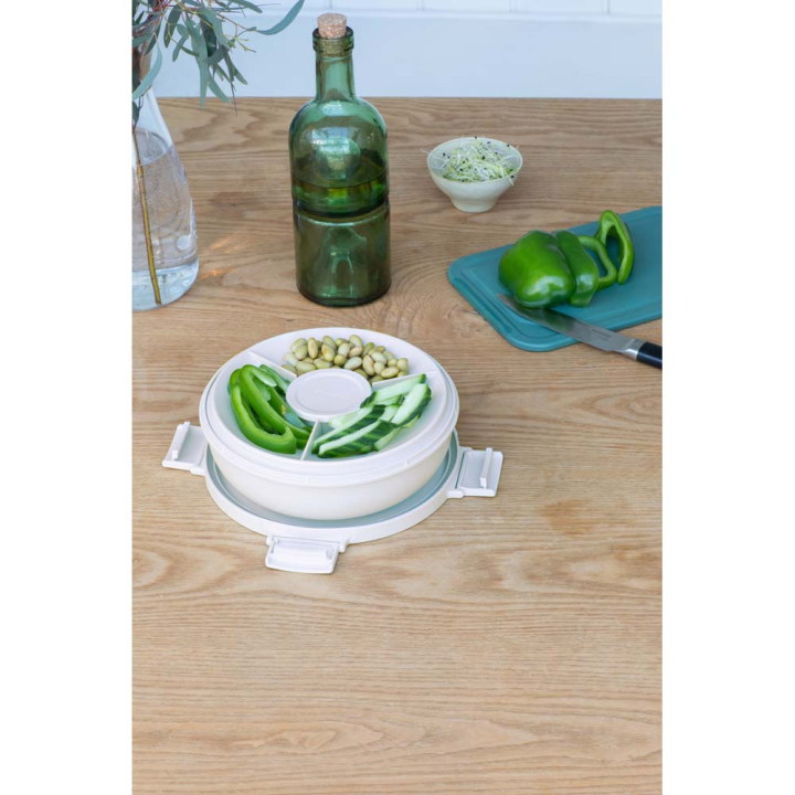 Здравословната домашна храна е приоритет за много хора, чието работно ежедневие преминава в офиса или в движение. Кутията за безопасно съхранение и пренасяне на салата и дресинг е важен аксесоар, който трябва да отговаря на всички изисквания за запазване на свежестта и вкуса на продуктите. Brabantia не изневерява на своето водещо мото при производството на модерни и еко изделия за бита: Освен природосъобразни, изработени от рециклирани и рециклируеми материали, те са с красива визия, в свежи цветове, в тон с духа на съвременния човек.
