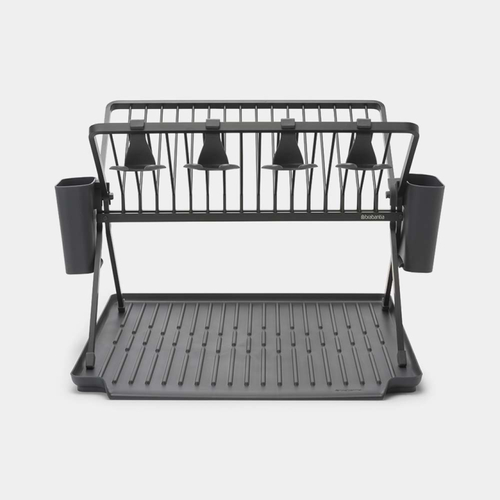 Елегантна и стабилна, тази голяма сгъваема поставка за сушене на съдове побира поне 17 чинии и предлага удобно място за 4 чаши за вино. Двете кошници за отцеждане на прибори са подвижни, което улеснява бързото сгъване за съхранение или пренасяне. Свободната тава за оттичане предотвратява влагата по плота на кухнята, като осигурява стичане на водата директно в мивката, чрез специалния отвор. Благодарение на меките силиконови накрайници, поставката не се подхлъзва и не надрасква повърхността. Материалът е здрав и устойчив на корозии.