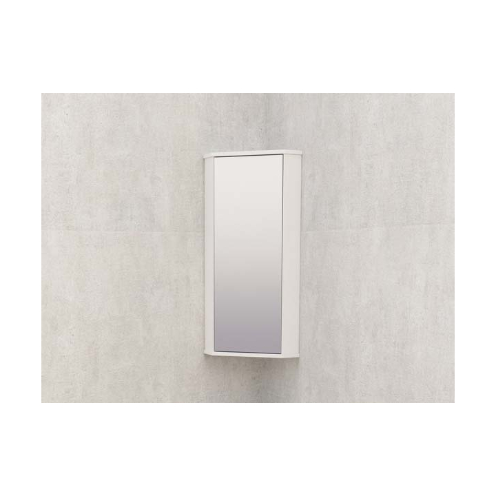Горен ъглов PVC шкаф с една огледална врата, корпус в Бяло, с изчистен дизайн и функционално разпределние. Няма възможност за избор на допълнителни цветове.