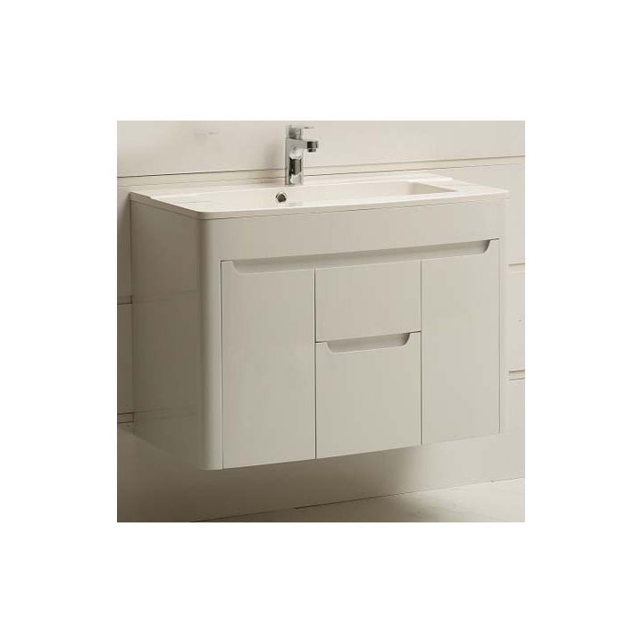 Долен PVC шкаф с две врати и две чекмеджета, в Бяло, с изчистен дизайн, полимер-мраморна мивка и функционално разпределние. Специалното формообразуване на вратите замества дръжките. Няма възможност за избор на допълнителни цветове.