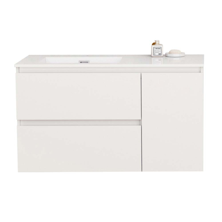 Шкафът е изработен от водоустойчив материал, с модерен и изчистен дизайн, без дръжки, в бял цвят. Няма възможност за избор на допълнителни цветове и конфигурации.