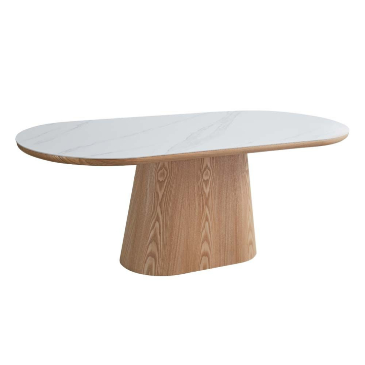 Масата е изработена с овален керамичен плот в съчетание с натурален дъбов фурнир и основа от МДФ.
