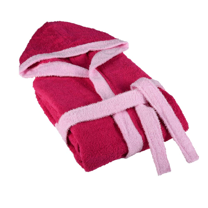 Памучен детски халат за баня с качулка. Мек, удобен и с отлична попивателна способност. Разполага с кант в различен цвят, който придава свеж и красив завършек на халата.