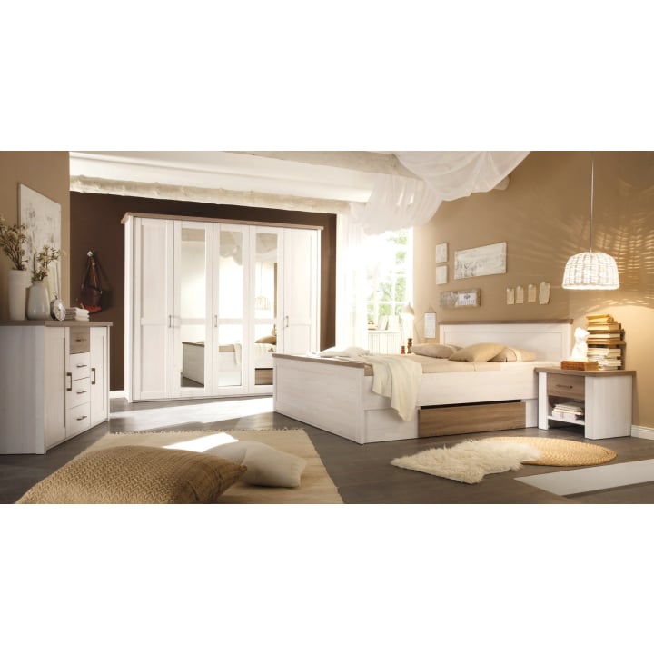 Този красив спален комплект притежава всичко необходимо за комфортен и здравословен сън, както и ежедневното практично съхранение на дрехи и лични вещи. Предложението е за покупка на легло в комплект с 2 нощни шкафчета и петкрилен гардероб. При необходимост от повече пространство за съхранение, към помещението може да добавите и комод със същата визия. Обърнете внимание, че нощните шкафчета са в комплект с леглото и не е нужно да бъдат закупени отделно.