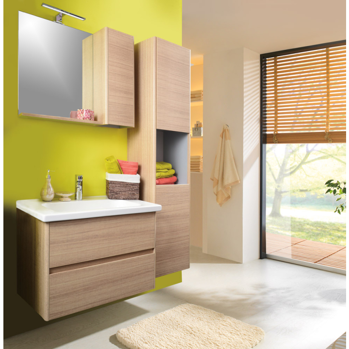 Комплект мебели за баня, състоящ се от долен шкаф за окачване без крака, с керамична мивка, горен шкаф с огледало и LED осветление и висока колонка. Комплектът се отличава с модерен дизайн, без дръжки и функционално разпределние. Мебелите са изработени от влагоустойчив MDF с меламиново покритие, в бяло. Системата се предлага и в декор Бял гланц - 58962010005.